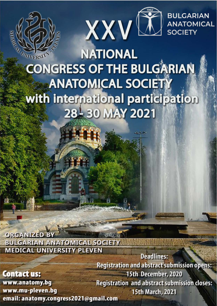 On behalf of the Organizing Committee and Bulgarian Anatomical Society, it is my pleasure to invite you to the XXV National Congress of the Bulgarian Anatomical Society with International Participation in Pleven, Bulgaria, from 28th to 30th May 2021.
